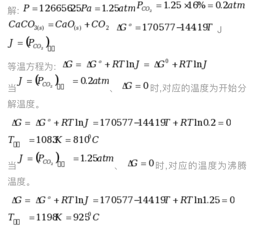 解: P=12665625Pa =1.25atm Pco = 1.25 16% = .2atmCaCO3s) =CaO)+CO G”=170577-14419T JI = (Po,o等温方程为: G = G+RTIn] = G'+RTInJ当 J = (Pco, = 0.2atm 、AG =0 时,对应的温度为开始分解温度AG = G°+ RTIn] =170577-14419 + RTIn0.2 =0=108K=810C