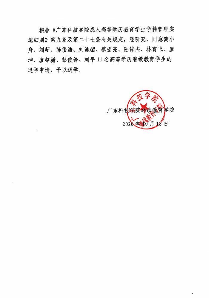 关于同意龚小舟等11名高等学历继续教育学生退学的决定